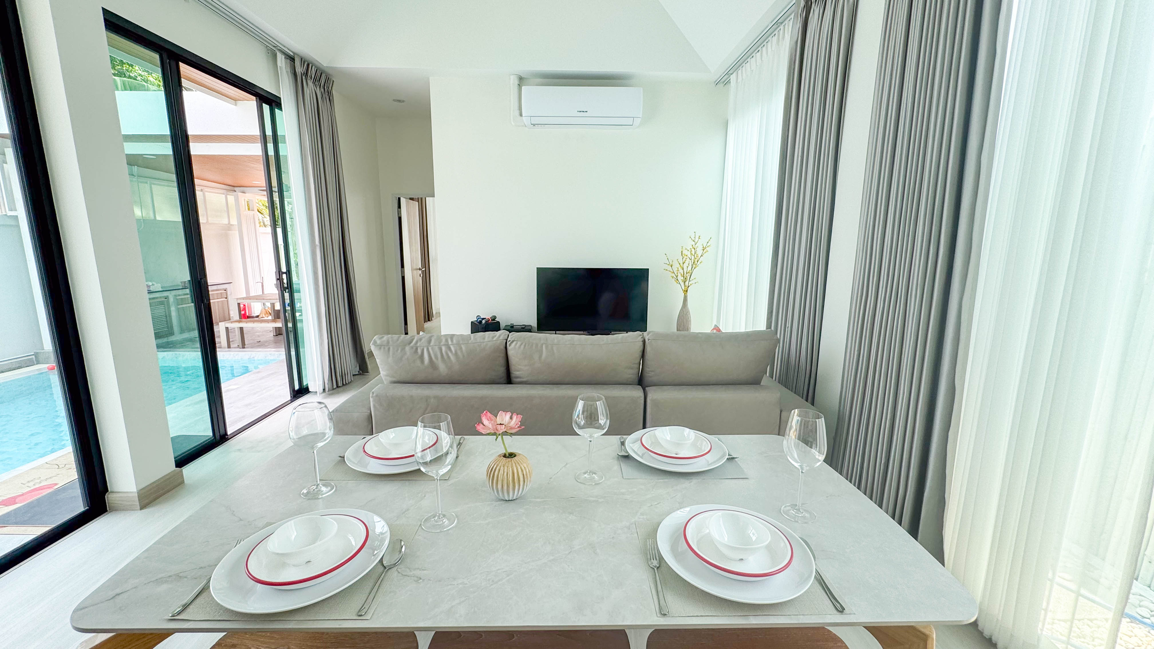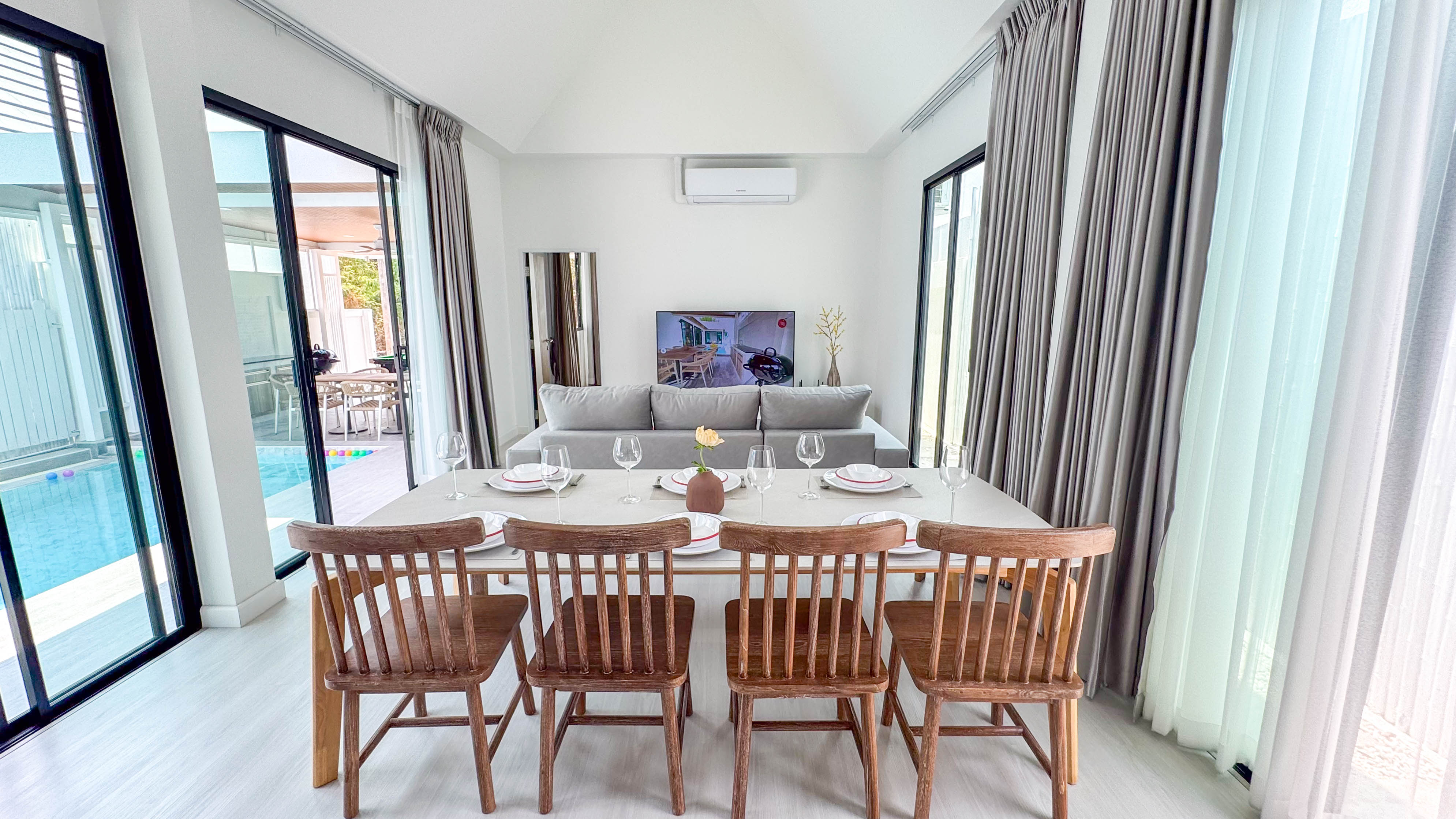 Pool Villa with 3 bedrooms, 3 bathrooms, Living room with indoor kitchen, Outdoor Kitchen, Pool table, Slider with Saltwater Pool 3*6 meters. Capacity 6-10 persons.