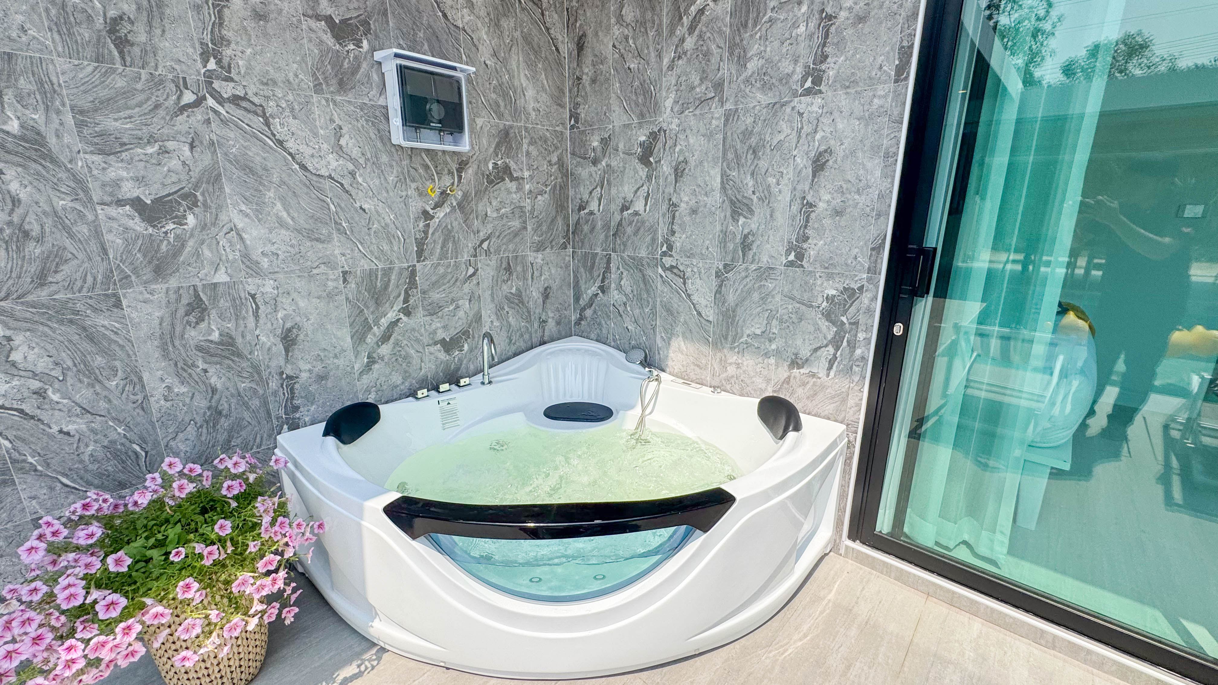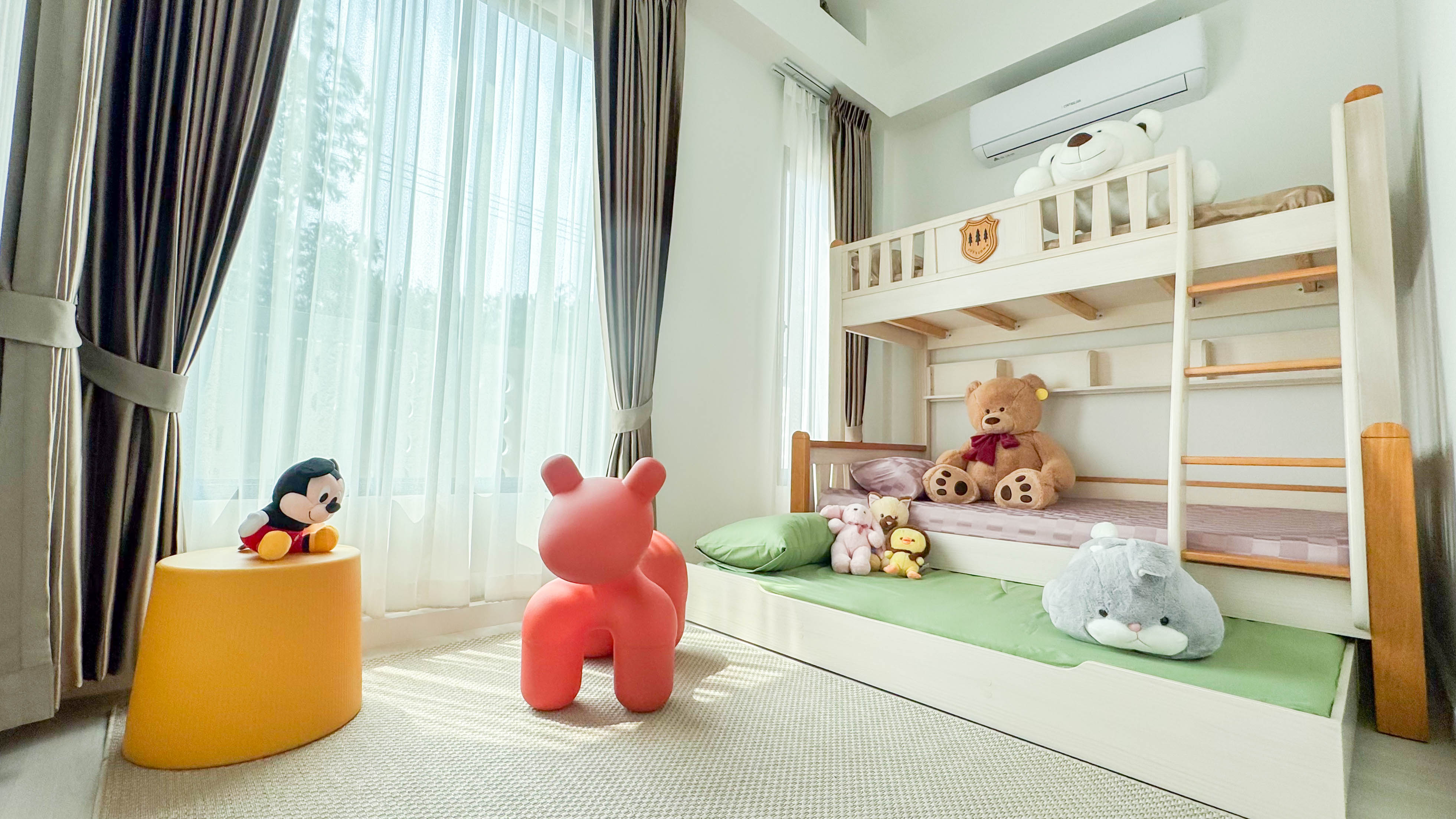 Pool Villa with 3 bedrooms (1 Kid room with bunk bed, suit for 3 pax), 3 bathrooms, Living room with indoor kitchen, Outdoor Kitchen, Pool table, Saltwater Pool 3*6, Outdoor Hot Jacuzzi, Capacity 6-10 persons.